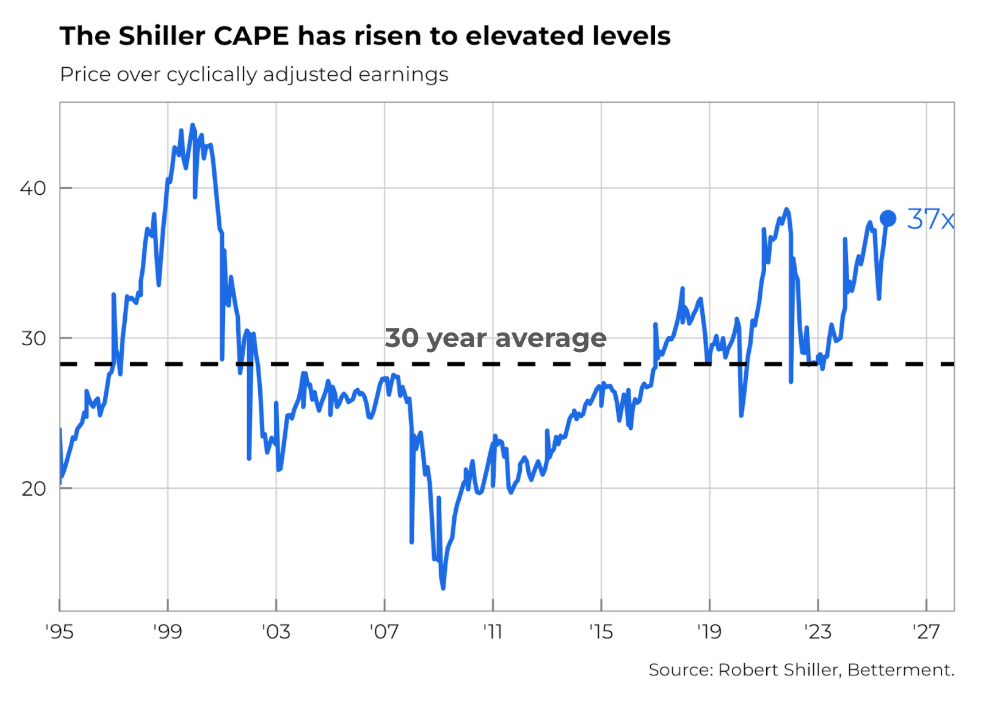 Bullishness, largely on the back of the AI investment boom, has pushed valuations into expensive territory, so investors should temper their expected returns. However, it doesn’t necessarily mean that the market will not rally further, or that a selloff is imminent. Goldman Sachs Global Investment Research notes that long-term earnings growth expectations, implied by market pricing, are still below 2021 and dotcom-era levels, which might indicate that investor expectations have not over-extended themselves as much as before. Goldman also highlights an important difference: The average P/E ratio of the 10 largest tech, media, and telecom stocks today is 31x—compared with 41x, at the height of the dotcom bubble, in December 1999.